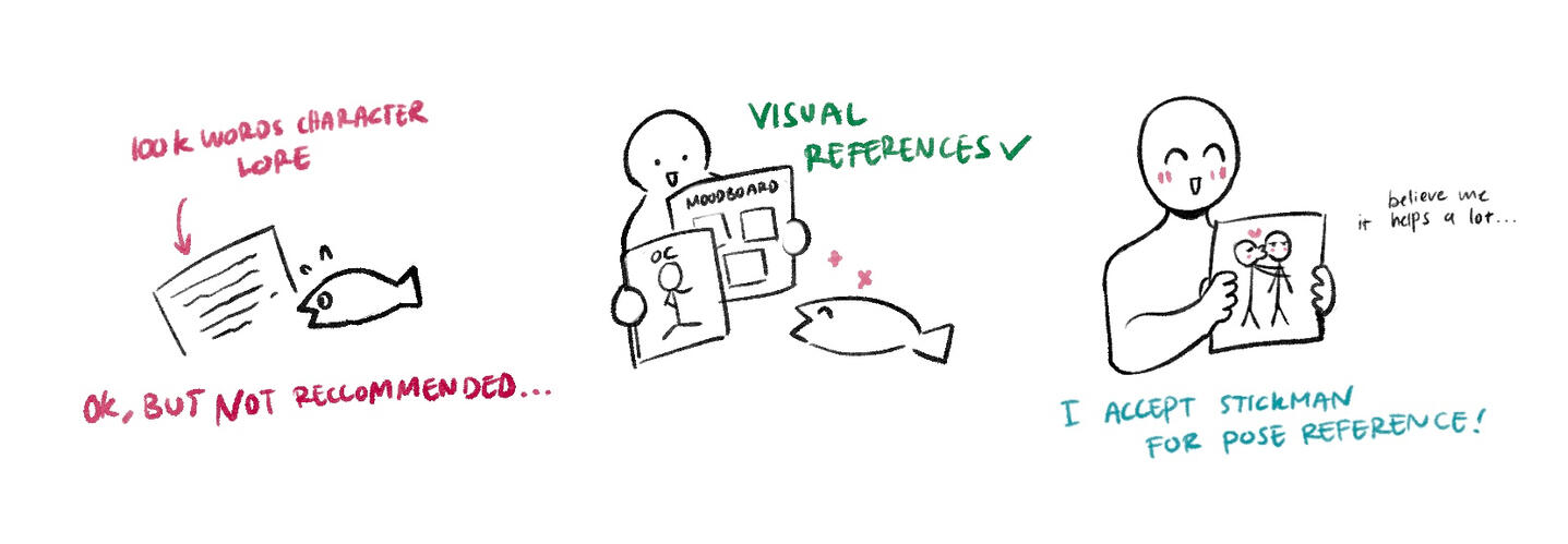 Client must provide at least one clear and concise visual reference; or any important information I may need to know to correctly draw the character.
